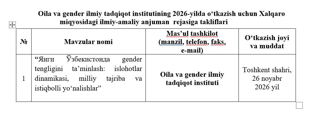 Oila va gender ilmiy tadqiqot institutining 2026-yilda o‘tkazish uchun Xalqaro miqyosidagi ilmiy-amaliy anjuman bo‘yicha tadbirlar rejasi: