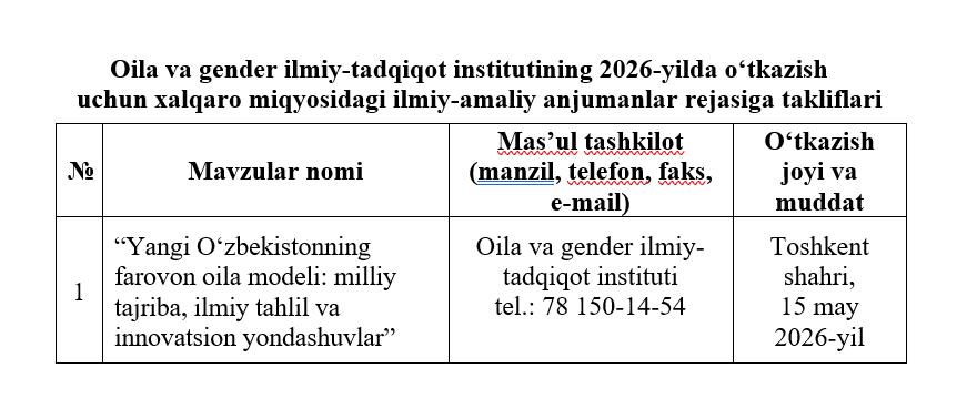 Oila va gender ilmiy-tadqiqot institutining 2026-yilda o‘tkazish uchun xalqaro miqyosidagi ilmiy-amaliy anjuman bo‘yicha tadbirlar rejasi: